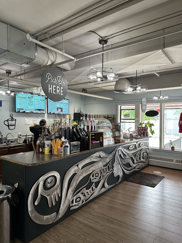 I also enjoyed Sacred Grounds (half-decent coffee shop pun), a 100% Native-owned and staffed business. The Central Council of Tlingit and Haida Indian Tribes of Alaska, specifically. The WiFi password is Ala$ka907 in case you find yourself there. I liked the beautiful wall mural, but my favorite was the metal relief at the counter: