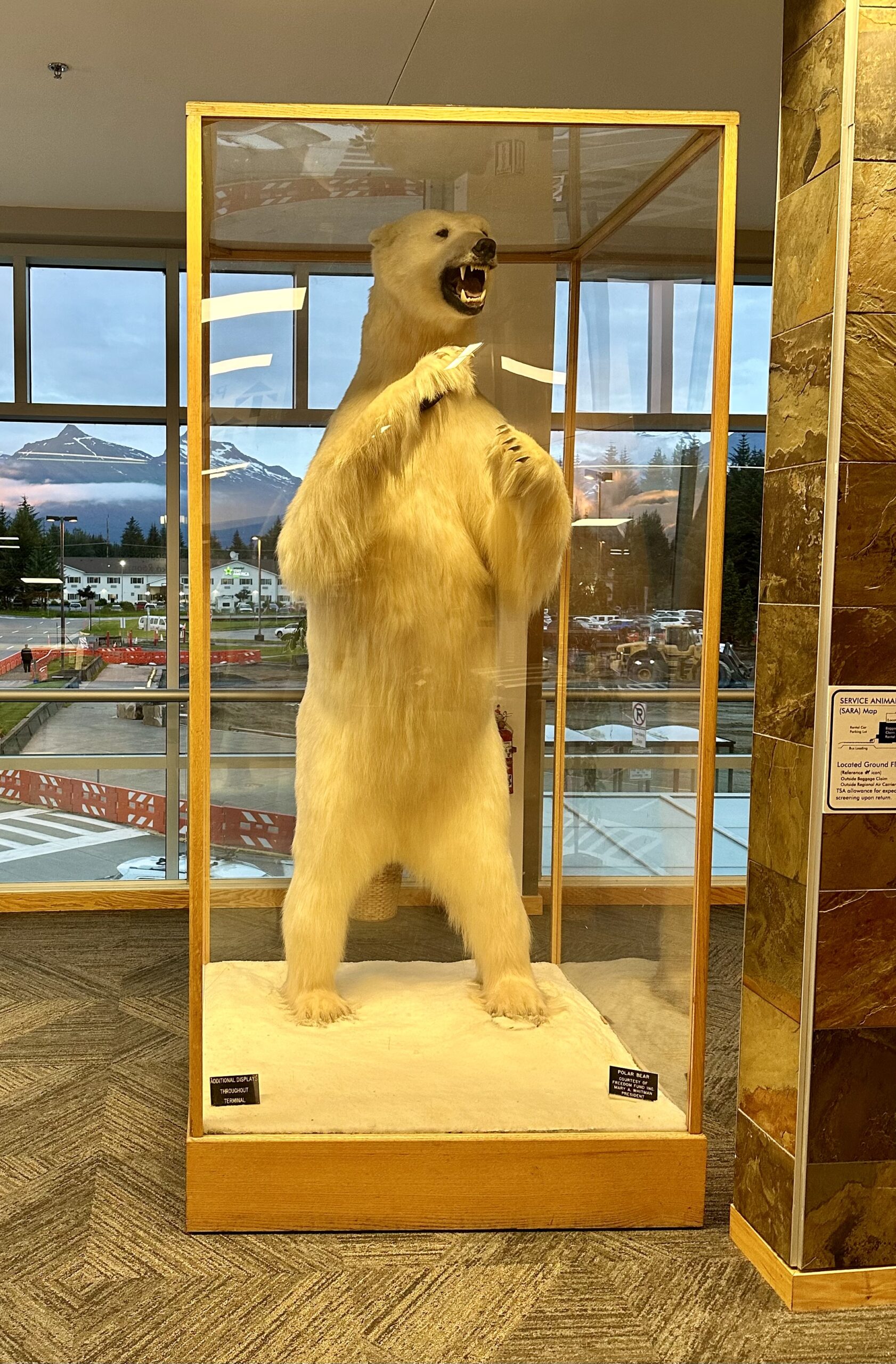 The airport itself is full of glass cases of stuffed bears. Probably not a bad idea to remind arriving tourists that there are indeed bears about. Bears will kill you, in case you haven’t seen The Revenant. I’ve seen bears in Alaska before, but alas, not on this trip, even with one excursion specifically looking for them I’ll get to later. I was clearly reminded of them a few days later when I saw the strewn-about garbage from a late-night dumpster pillaging from a local bear. It’s no wonder all local trash cans have bear locks of varying intensity. Even the public trash cans have a special closing mechanism in which you slide your hand into a little metal too-small-for-a-bear casing to pull a handle to open it, which simultaneously stops bears and confuses the more hapless tourists. Later in the trip, upon nearing the Juneau airport on a tiny Alaska Seaplane, a fellow passenger looked down spotted a bear some 100 yards from the airport (I missed it).
