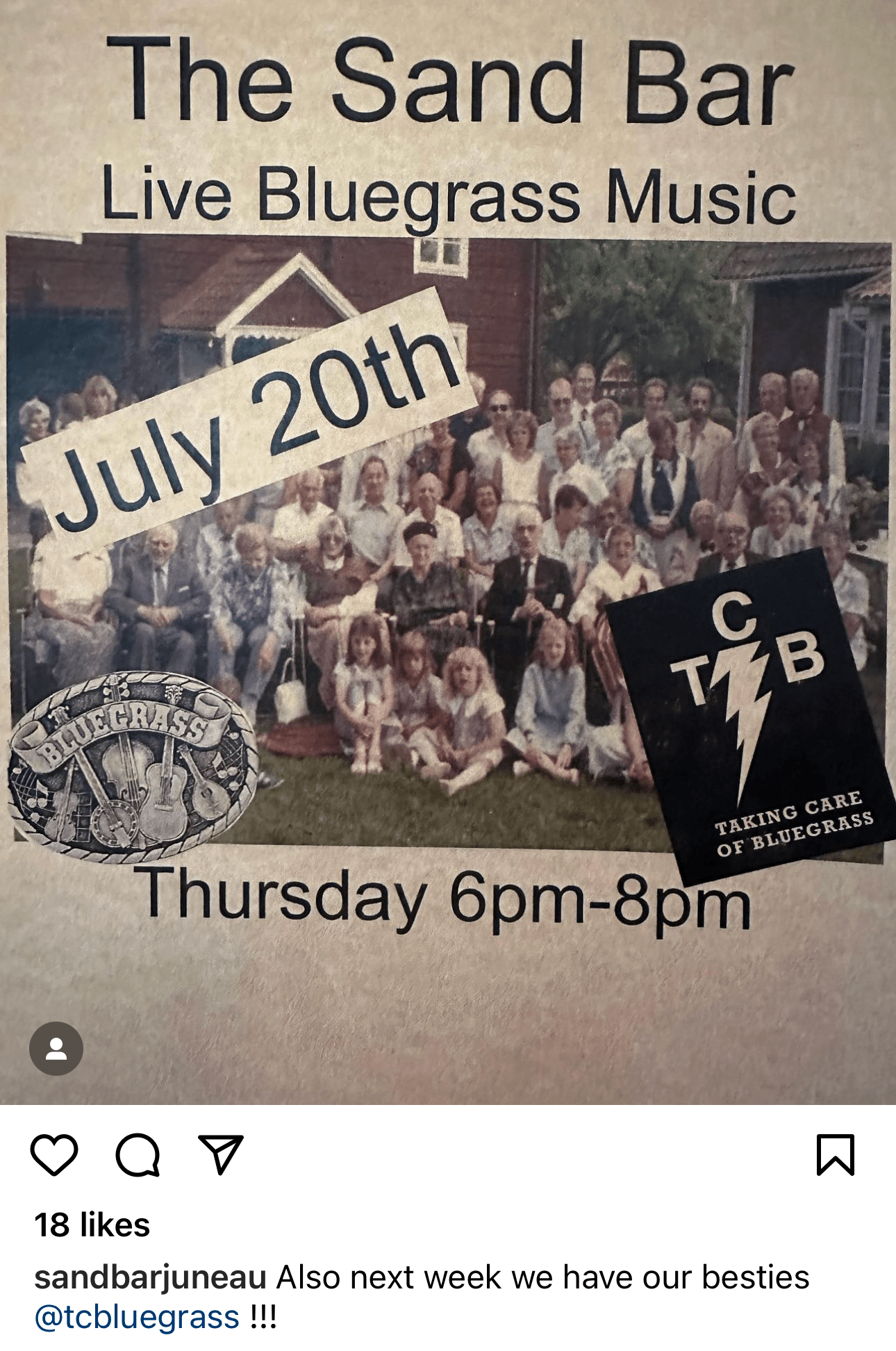 Then we popped out to Sandbar, in the valley, as it were, just far enough out no cruise ship tourists would ever make it. There was a band playing with a wonderfully cheesy name: TCB (Taking Care of Bluegrass). They were damn good! I would know, as I was in a local bluegrass band that wasn’t half as good.